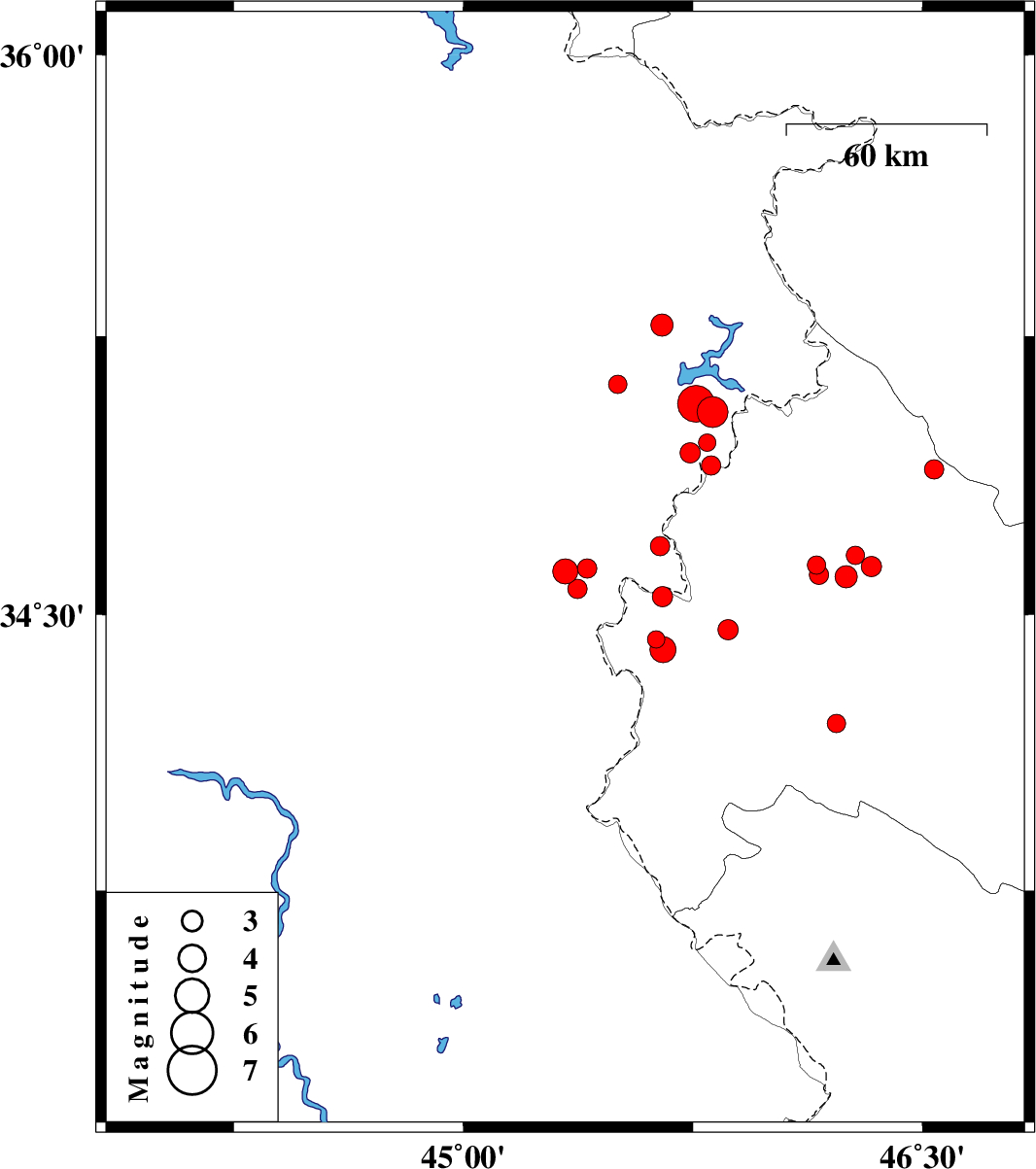 | 2017/12/09 | 06:40:31.3 | 10:10:31.3 | 34.608 | 46.162 | 6 | ML2.8 | Kermanshah Province, 30 km North-East of Sar-e pol-e zahab | ||