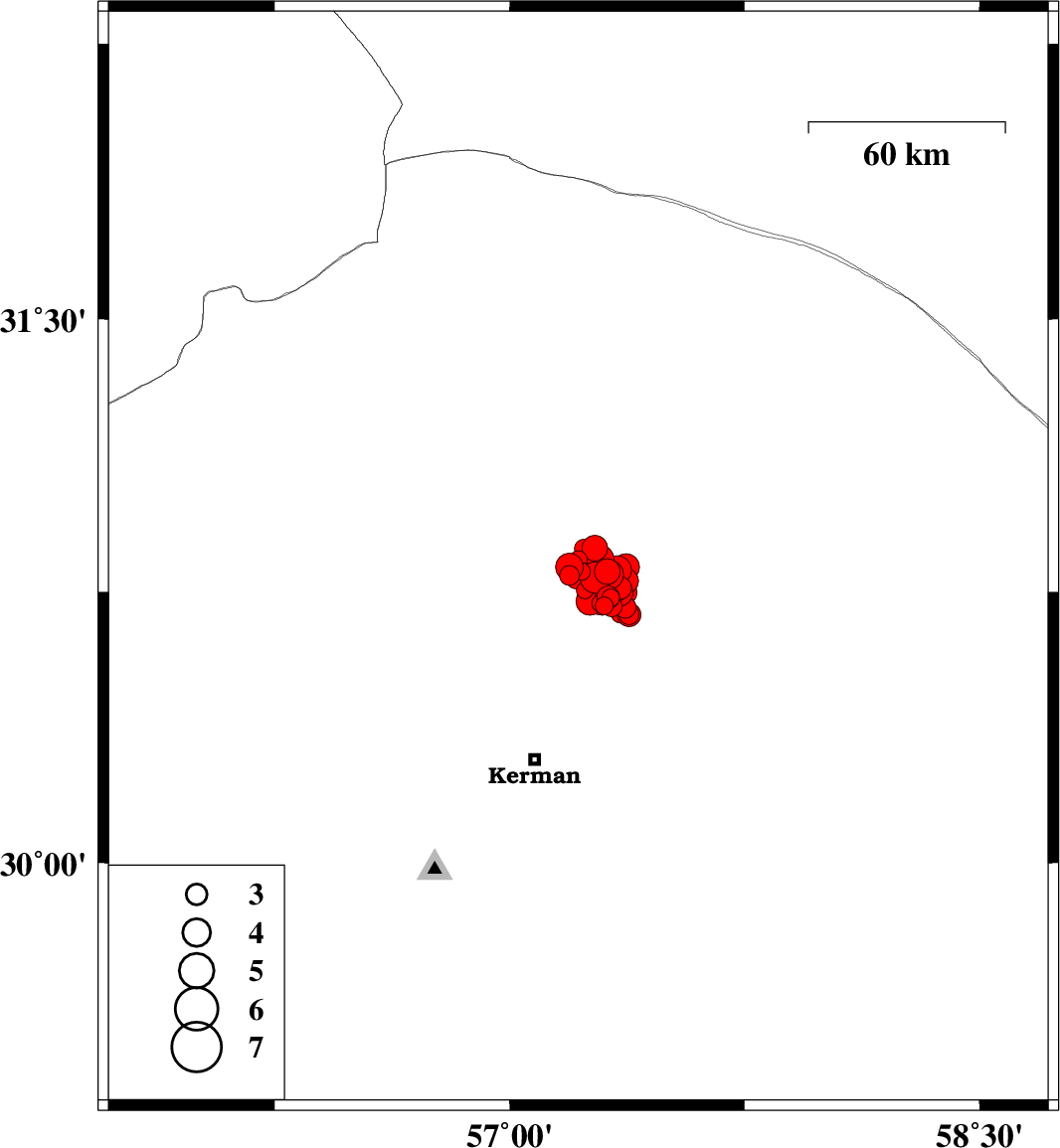 2017/12/16 | 02:20:30.4 | 05:50:30.4 | 30.79 | 57.275 | 15 | ML:4.5 | Kerman Province, 59 km North-East of Kerman | ||