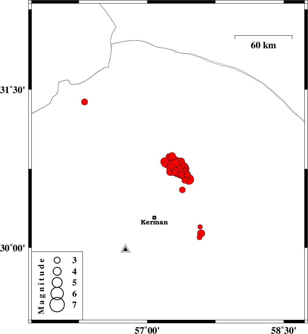 | 2017/12/12 | 10:26:26.1 | 13:56:26.1 | 30.774 | 57.293 | 14 | ML4 | Kerman Province, 58 km North-East of Kerman | ||