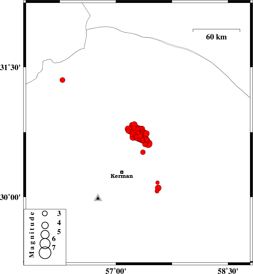 | 2017/12/06 | 01:29:51.4 | 04:59:51.4 | 30.777 | 57.399 | 14 | ML4 | Kerman Province, 62 km North-East of Kerman | ||