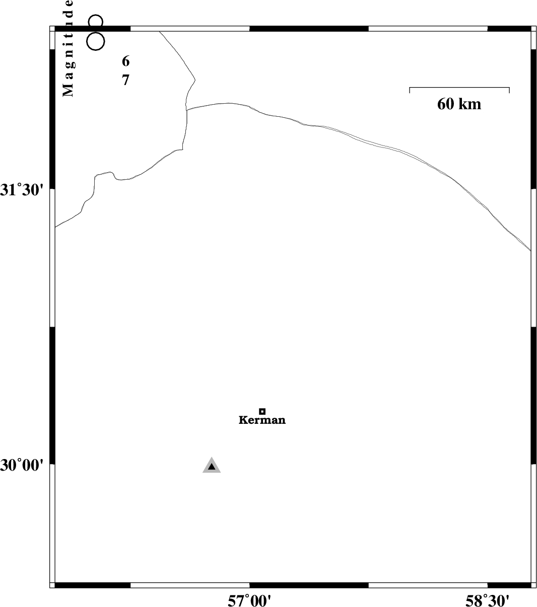 2017/12/16 | 02:20:30.4 | 05:50:30.4 | 30.79 | 57.275 | 15 | ML:4.5 | Kerman Province, 59 km North-East of Kerman | ||