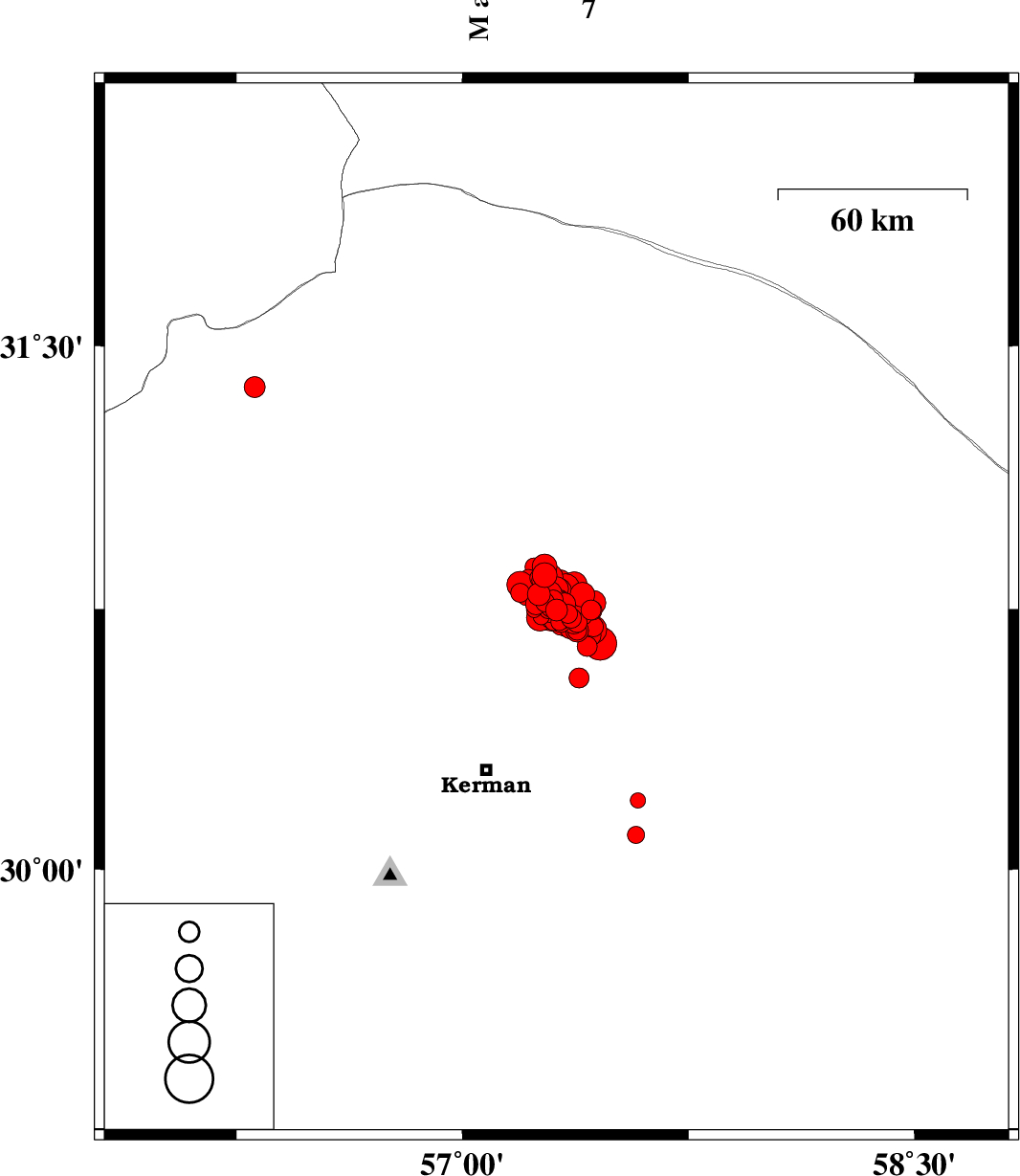 2017/12/04 | 03:44:03.8 | 07:14:03.8 | 30.784 | 57.336 | 14 | ML:2.8 | Kerman Province, 60 km North-East of Kerman | ||