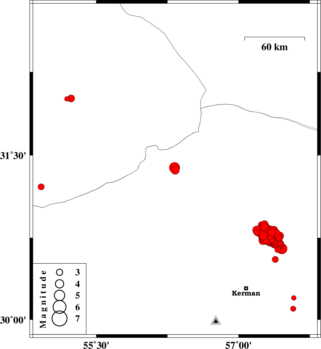 | 2017/12/12 | 10:26:26.1 | 13:56:26.1 | 30.774 | 57.293 | 14 | ML4 | Kerman Province, 58 km North-East of Kerman | ||