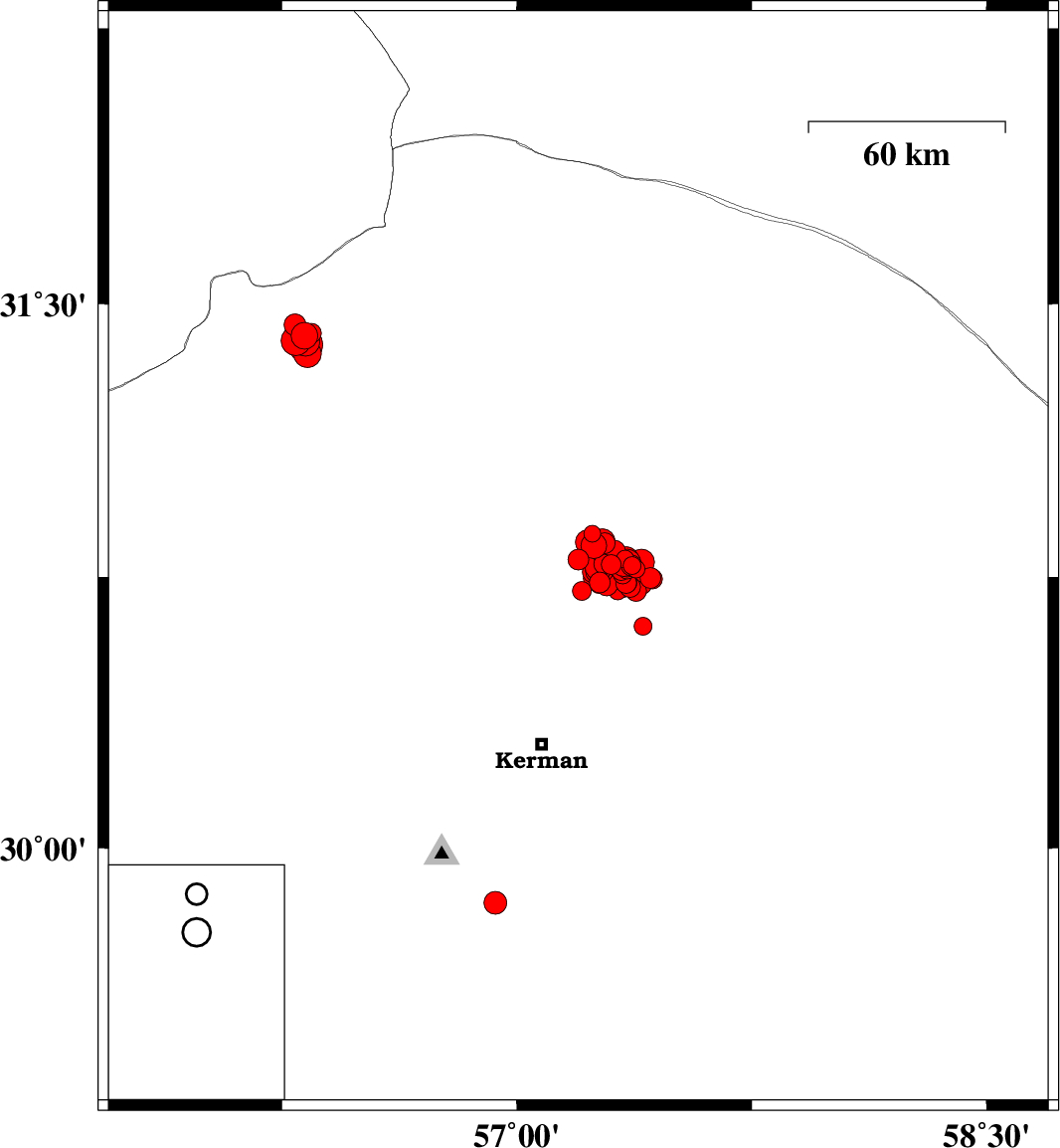 2017/12/19 | 14:47:42.3 | 18:17:42.3 | 30.723 | 57.362 | 14 | ML:3 | Kerman Province, 55 km North-East of Kerman | ||