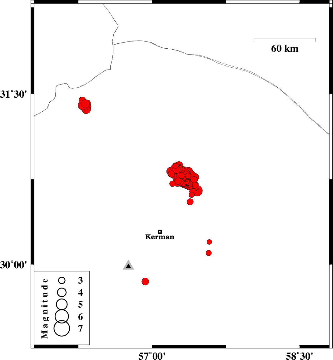 2017/12/16 | 02:20:30.4 | 05:50:30.4 | 30.79 | 57.275 | 15 | ML:4.5 | Kerman Province, 59 km North-East of Kerman | ||