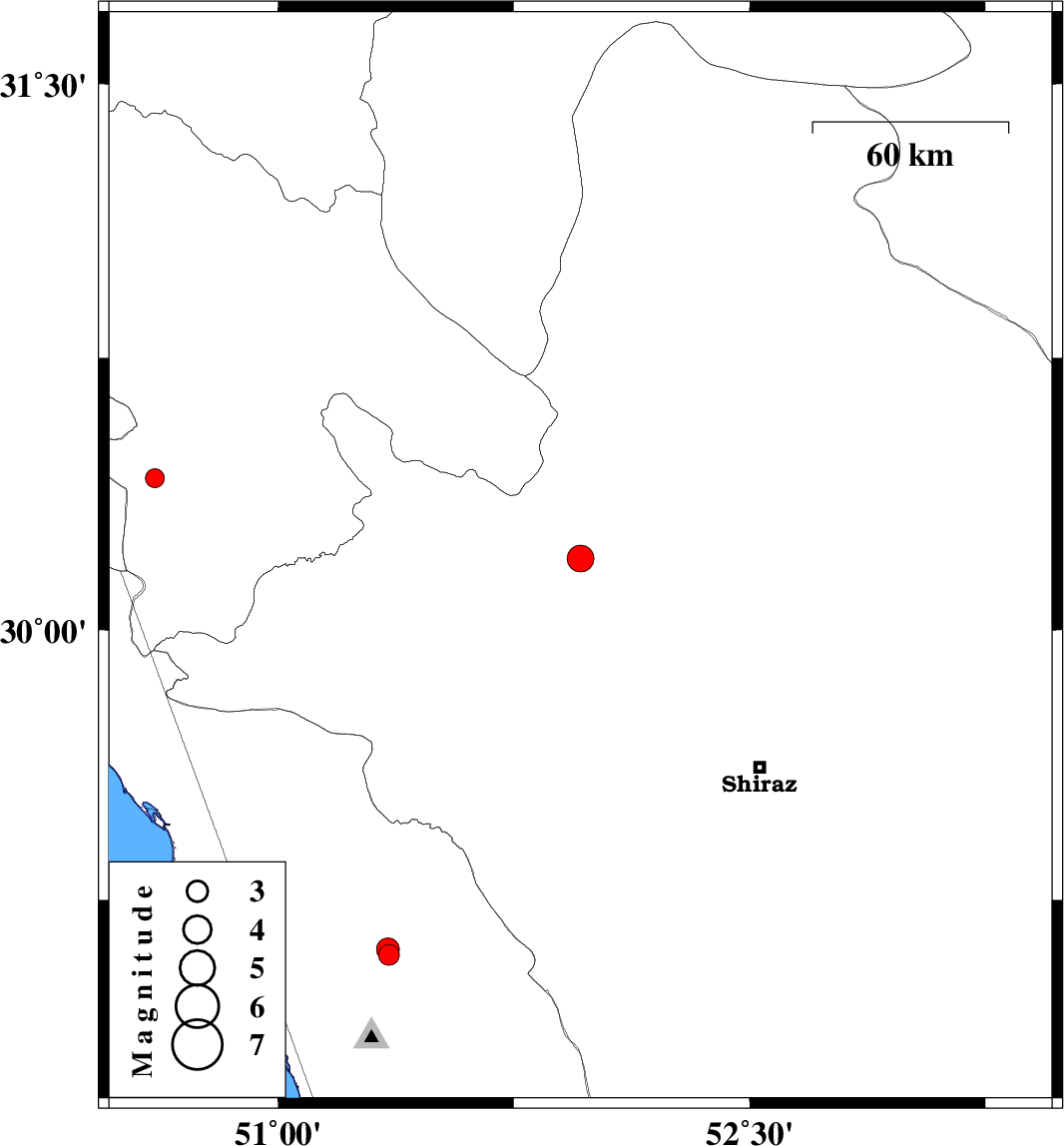 | 2017/11/29 | 16:44:18.4 | 20:14:18.4 | 29.112 | 51.35 | 15 | ML3.2 | Bushehr Province, 22 km South-East of Borazjan |