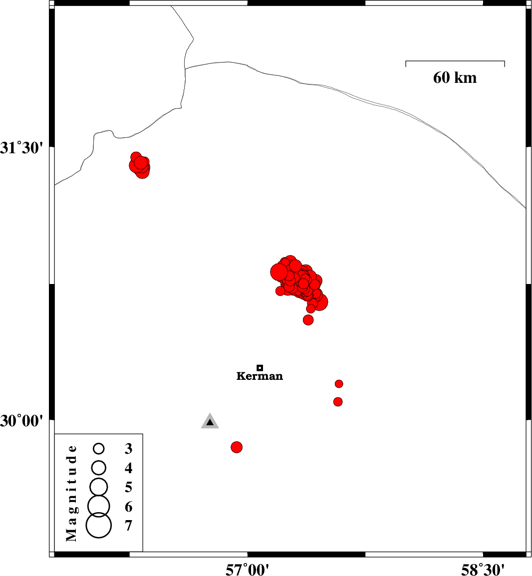 | 2017/12/06 | 01:29:51.4 | 04:59:51.4 | 30.777 | 57.399 | 14 | ML4 | Kerman Province, 62 km North-East of Kerman | ||