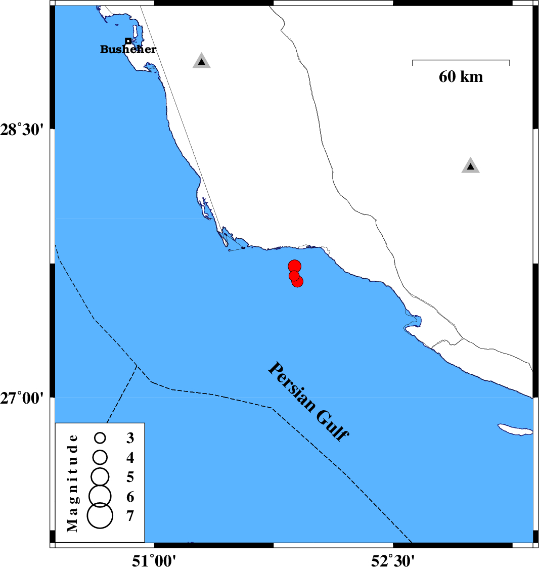 | 2017/12/27 | 00:34:04.9 | 04:04:04.9 | 27.735 | 51.882 | 17 | ML3.6 | Persian Gulf, 20 km -West of Bandar-e kangan | ||