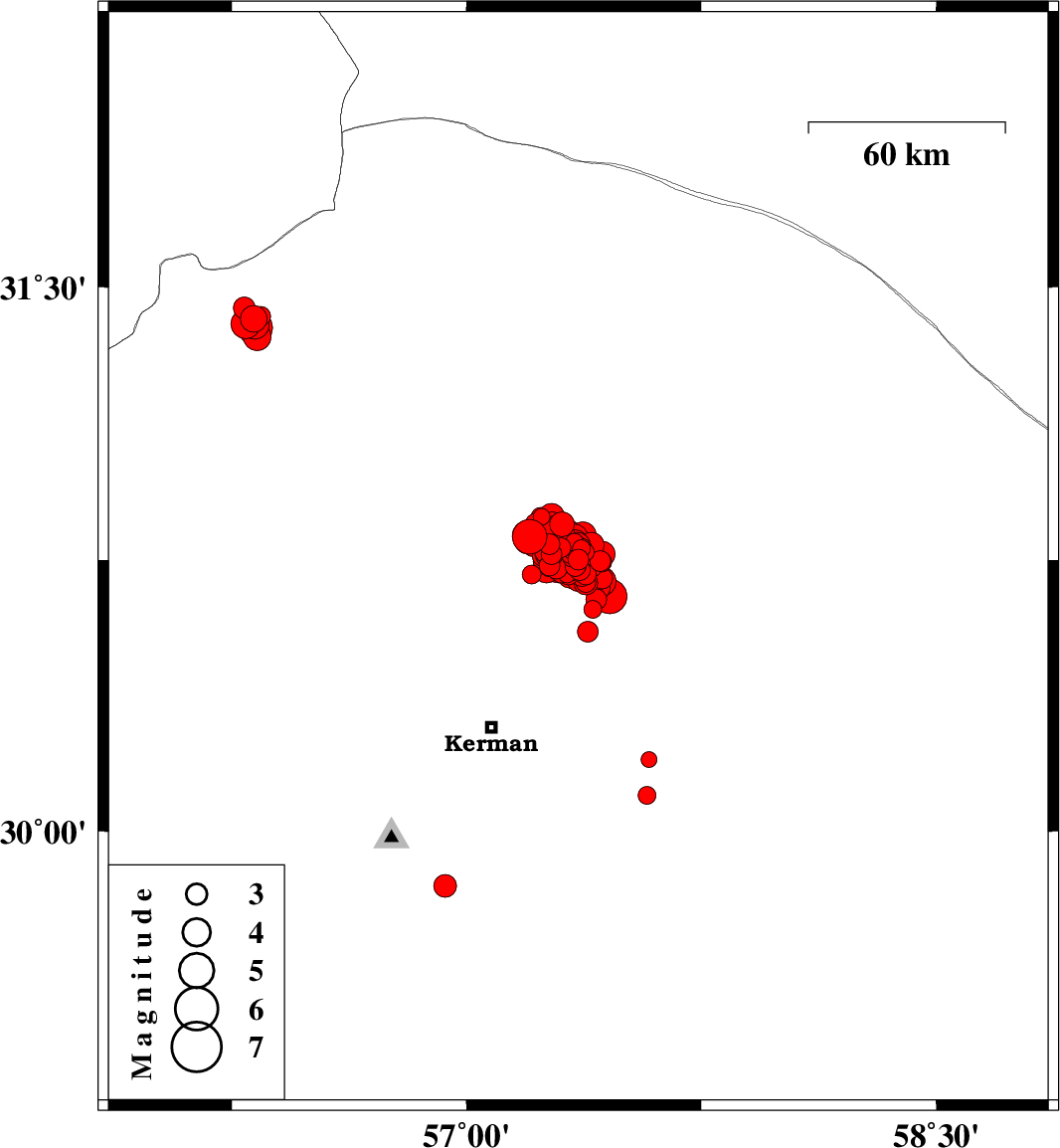 | 2017/12/06 | 01:29:51.4 | 04:59:51.4 | 30.777 | 57.399 | 14 | ML4 | Kerman Province, 62 km North-East of Kerman | ||