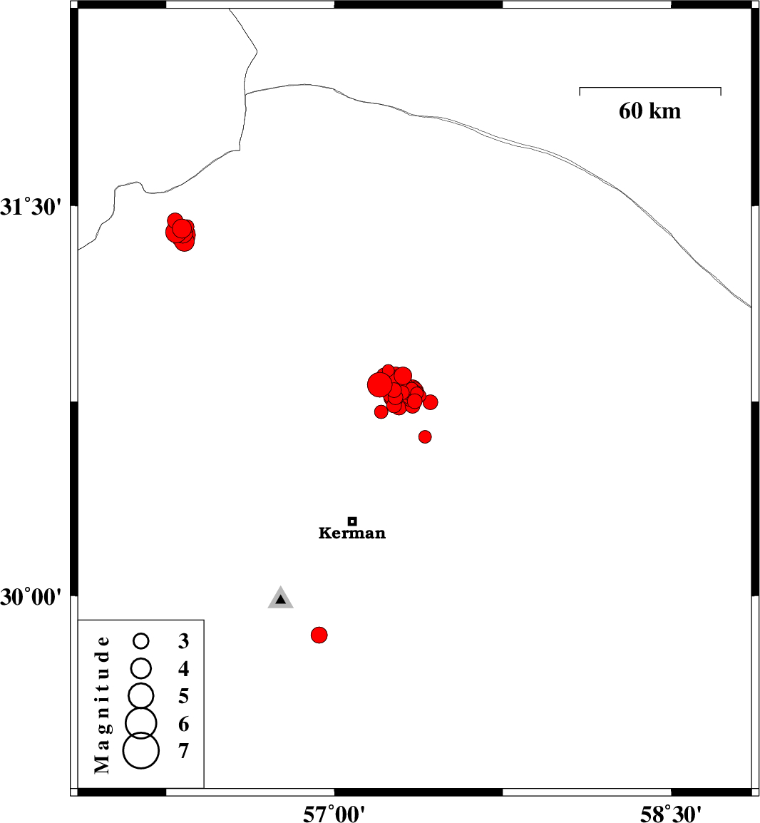 | 2017/12/27 | 10:13:09.7 | 13:43:09.7 | 30.751 | 57.357 | 14 | ML2.9 | Kerman Province, 58 km North-East of Kerman | ||