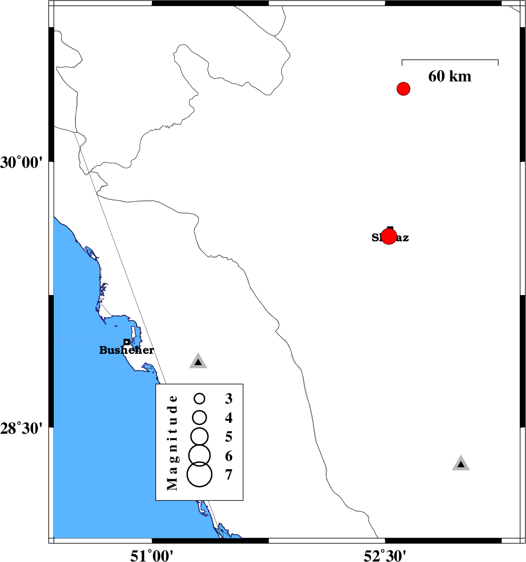 | 2017/12/30 | 20:53:23.4 | 00:23:23.4 | 29.369 | 51.868 | 15 | ML4.6 | Fars Province, 35 km South-East of Kazerun | ||