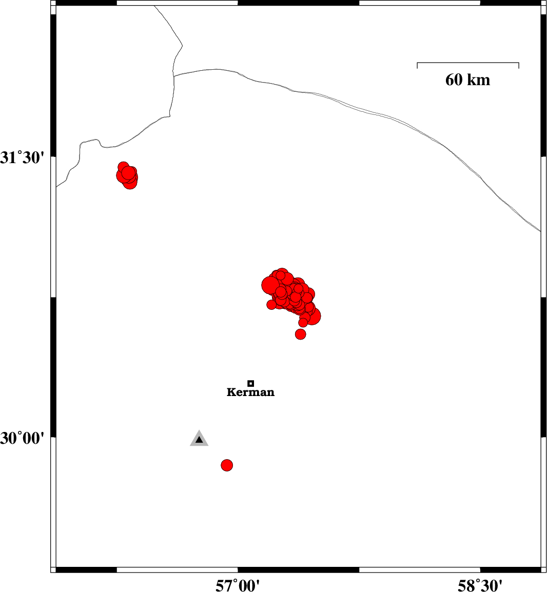 | 2017/12/27 | 10:13:09.7 | 13:43:09.7 | 30.751 | 57.357 | 14 | ML2.9 | Kerman Province, 58 km North-East of Kerman | ||