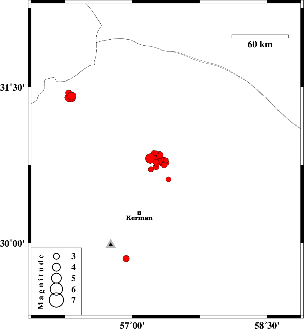 | 2017/12/27 | 10:13:09.7 | 13:43:09.7 | 30.751 | 57.357 | 14 | ML2.9 | Kerman Province, 58 km North-East of Kerman | ||