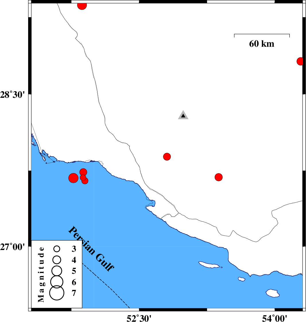 | 2017/12/27 | 00:34:04.9 | 04:04:04.9 | 27.735 | 51.882 | 17 | ML3.6 | Persian Gulf, 20 km -West of Bandar-e kangan | ||