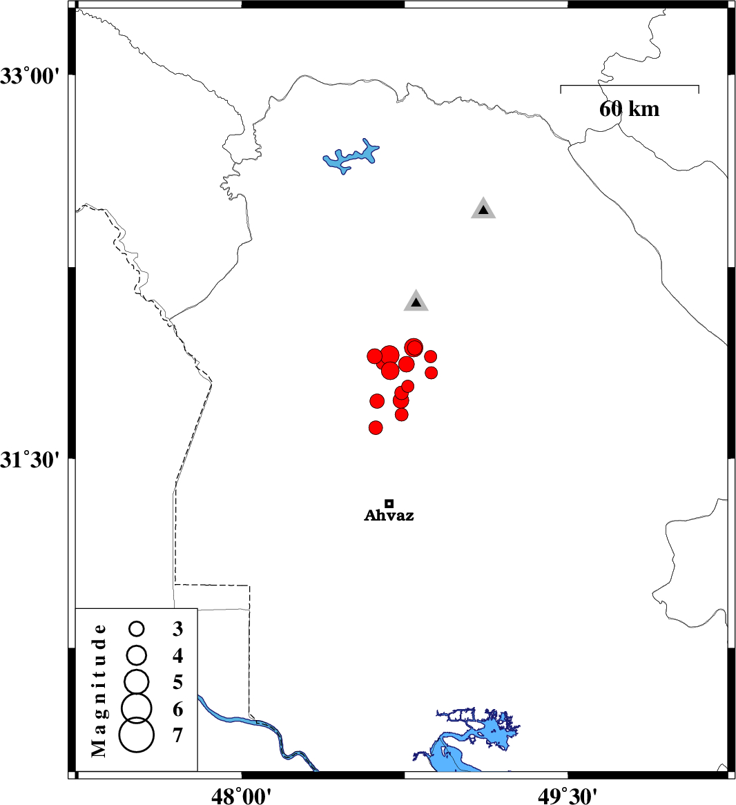 | 2017/12/25 | 00:20:33.1 | 03:50:33.1 | 31.876 | 48.649 | 15 | ML2.8 | Khoozestan Province, 27 km South-West of Shushtar |
