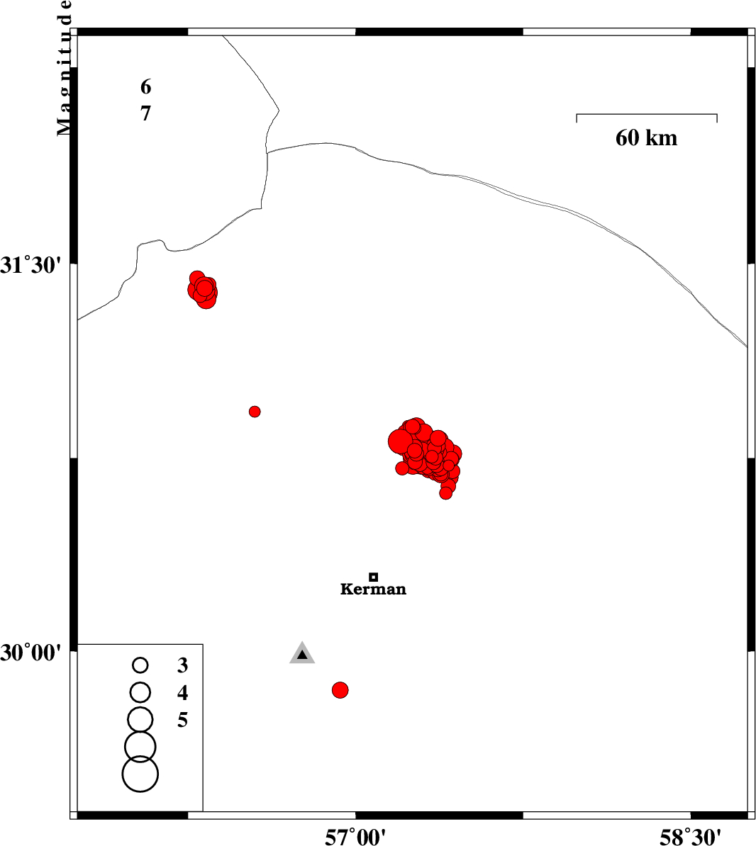 | 2017/12/12 | 10:26:26.1 | 13:56:26.1 | 30.774 | 57.293 | 14 | ML4 | Kerman Province, 58 km North-East of Kerman | ||