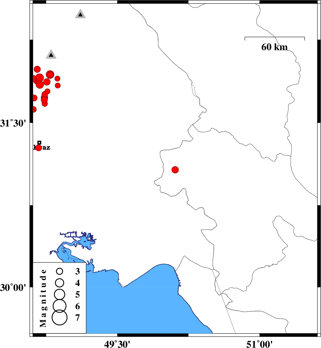 | 2017/12/30 | 07:48:20.3 | 11:18:20.3 | 31.845 | 48.683 | 15 | ML3.7 | Khoozestan Province, 27 km South-West of Shushtar | ||