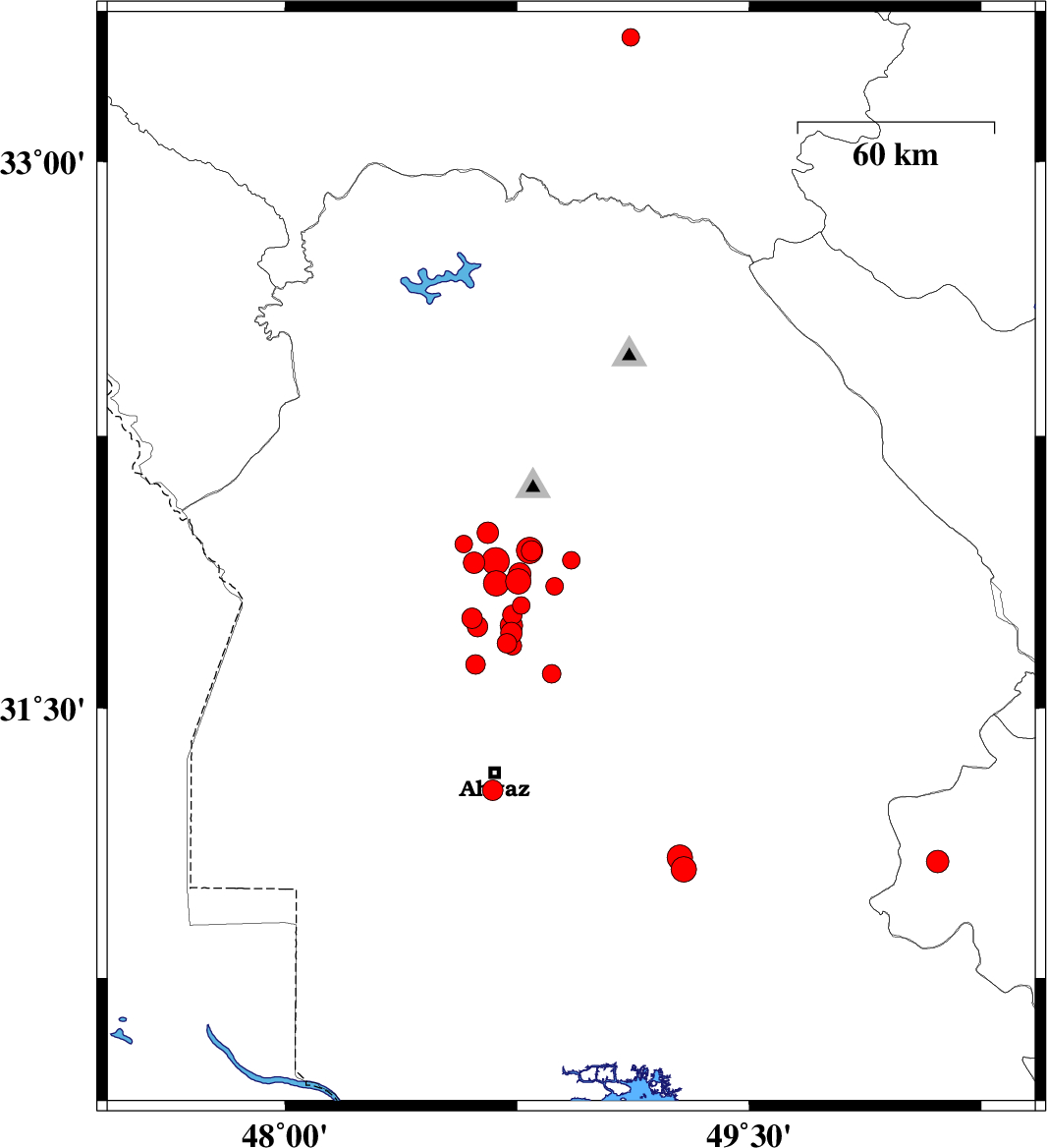 2018/01/02 | 23:39:15.1 | 03:09:15.1 | 31.053 | 49.288 | 15 | ML:3.6 | Khoozestan Province, 39 km South-West of Ramhormoz | ||