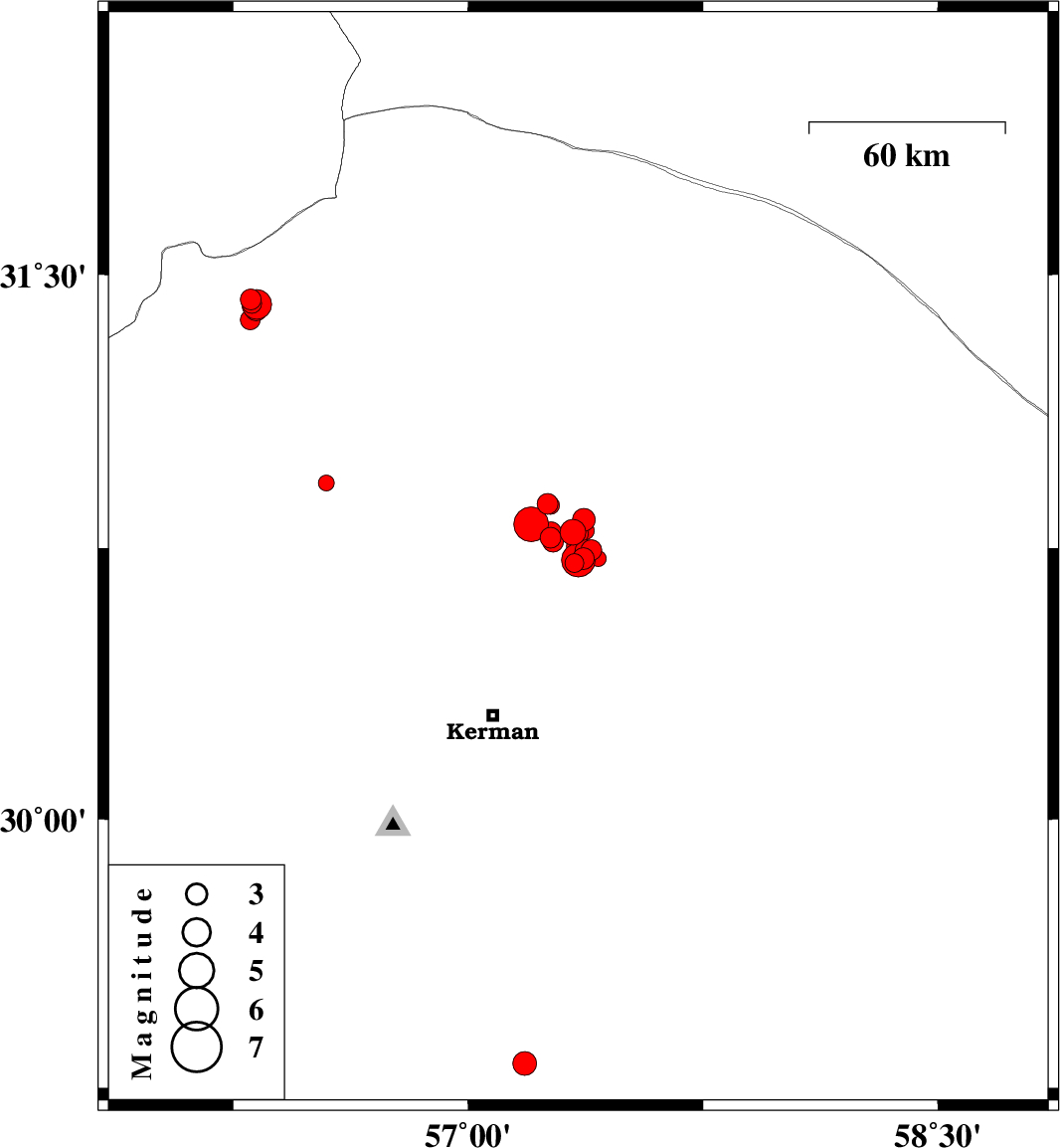 2017/12/27 18:01:14.3 21:31:14.3 30.81557.20114 ML5 Kerman Province, 60 km -East of Zarand