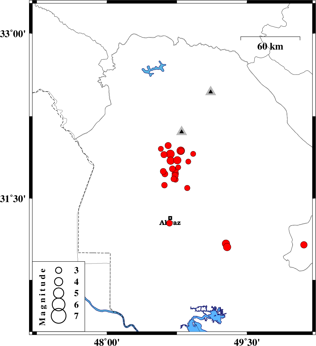 | 2018/01/01 | 13:39:47.4 | 17:09:47.4 | 31.273 | 48.671 | 5 | ML2.9 | Khoozestan Province, 5 km of Ahvaz | ||