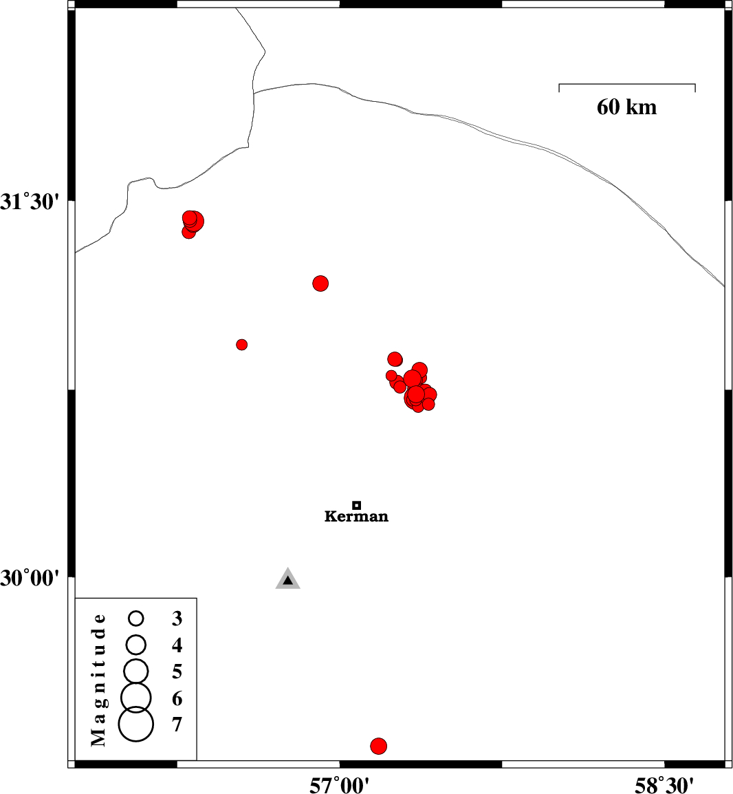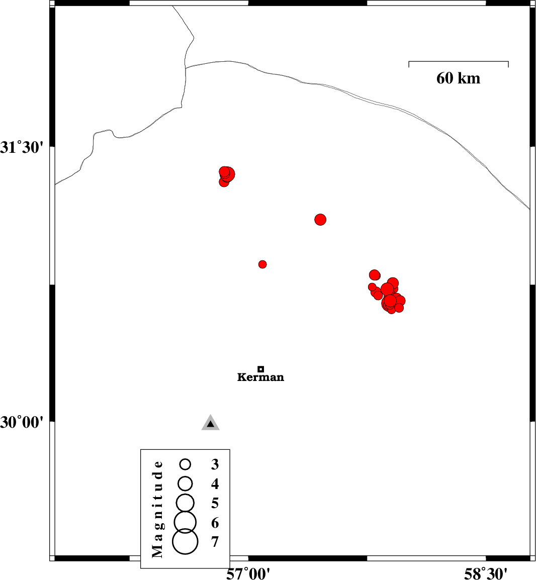 | 2018/01/04 | 03:55:21.8 | 07:25:21.8 | 30.682 | 57.362 | 14 | ML2.4 | Kerman Province, 52 km North-East of Kerman | ||