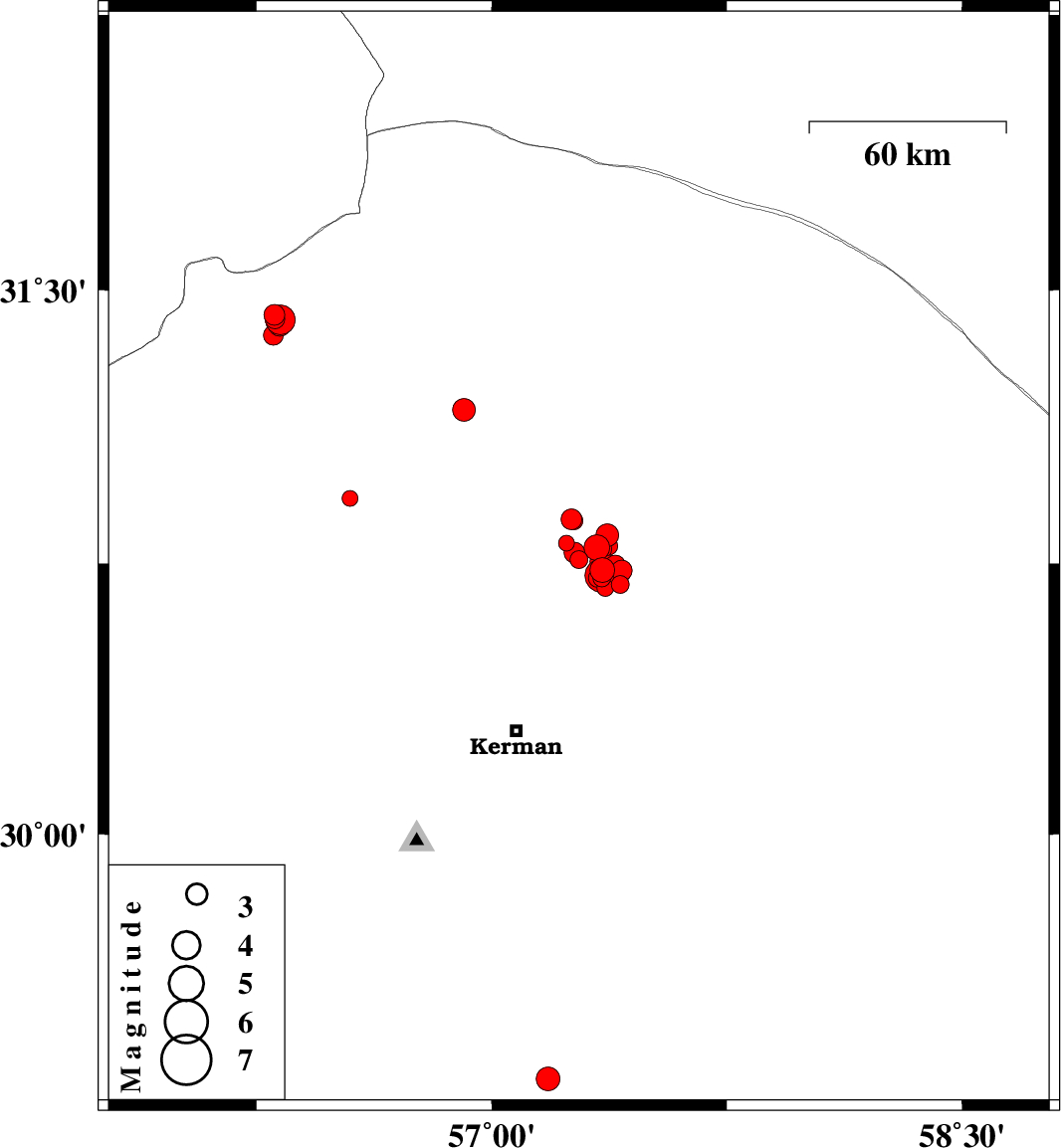 | 2017/12/30 | 07:43:16.9 | 11:13:16.9 | 30.779 | 57.264 | 14 | ML2.9 | Kerman Province, 57 km North-East of Kerman |