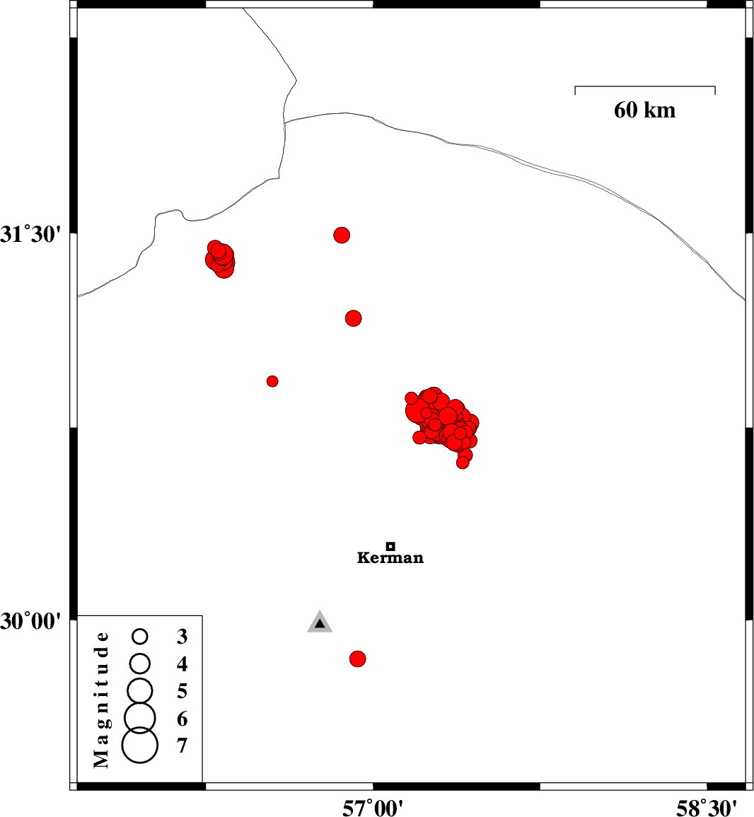 | 2017/12/12 | 09:50:29.2 | 13:20:29.2 | 30.796 | 57.311 | 15 | ML4 | Kerman Province, 61 km North-East of Kerman | ||