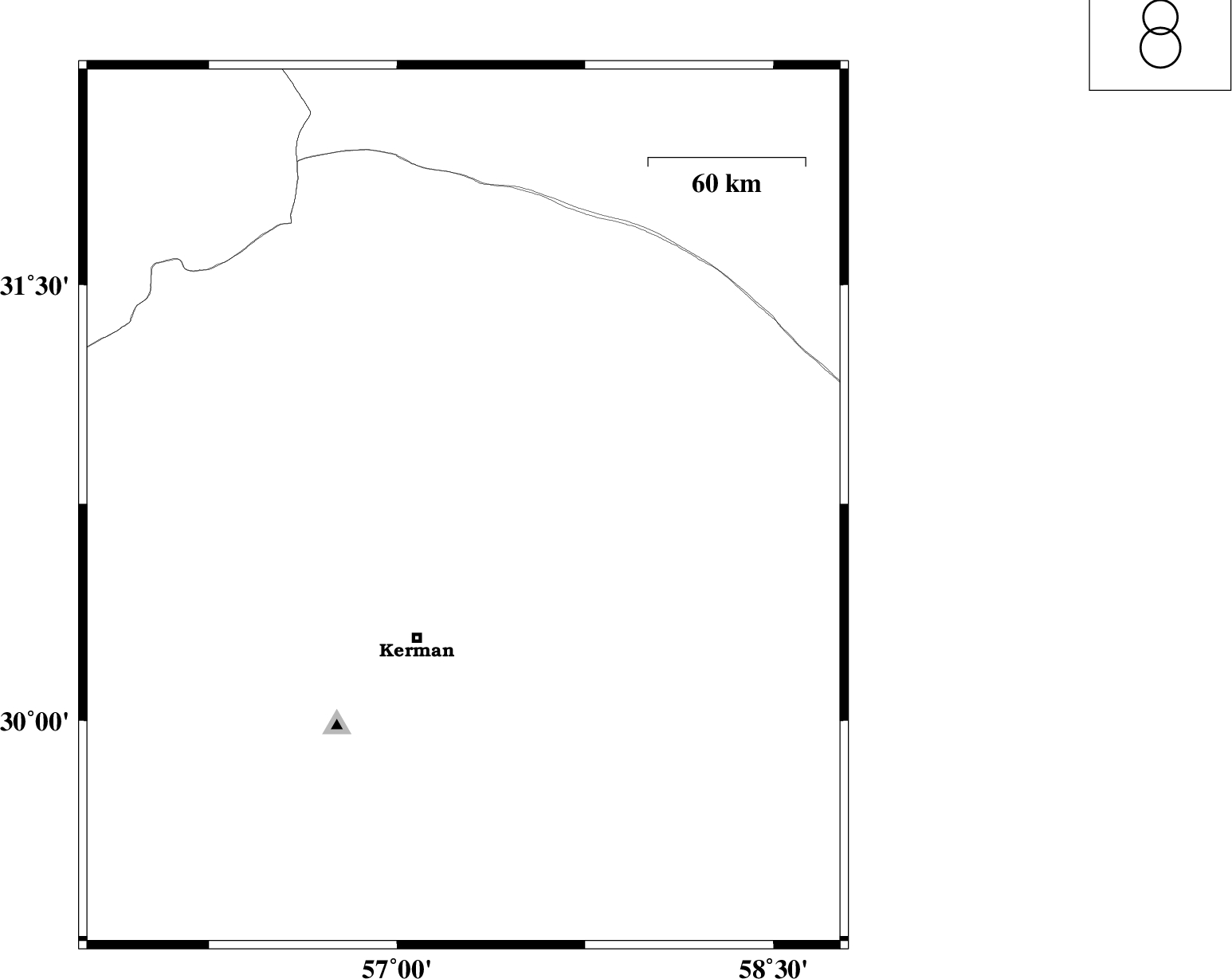2017/12/24 | 05:41:44.7 | 09:11:44.7 | 30.802 | 57.286 | 16 | ML:3.5 | Kerman Province, 60 km North-East of Kerman | ||