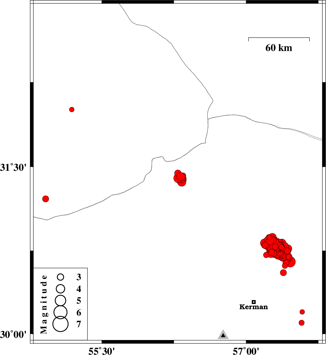 2017/12/16 | 02:20:30.4 | 05:50:30.4 | 30.79 | 57.275 | 15 | ML:4.5 | Kerman Province, 59 km North-East of Kerman | ||