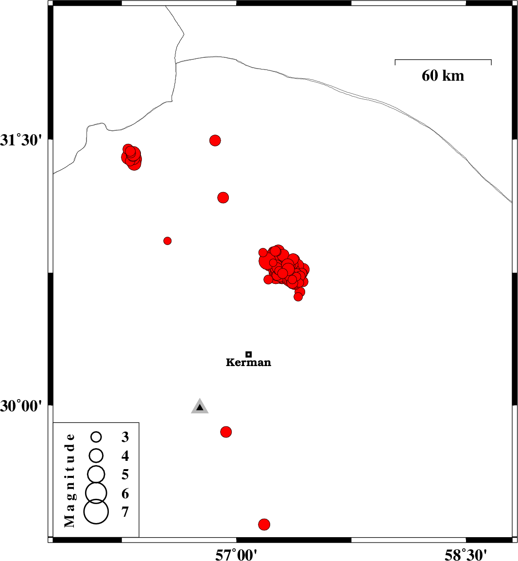 | 2017/12/12 | 09:36:20.0 | 13:06:20.0 | 30.708 | 57.369 | 14 | ML3.1 | Kerman Province, 54 km North-East of Kerman | ||