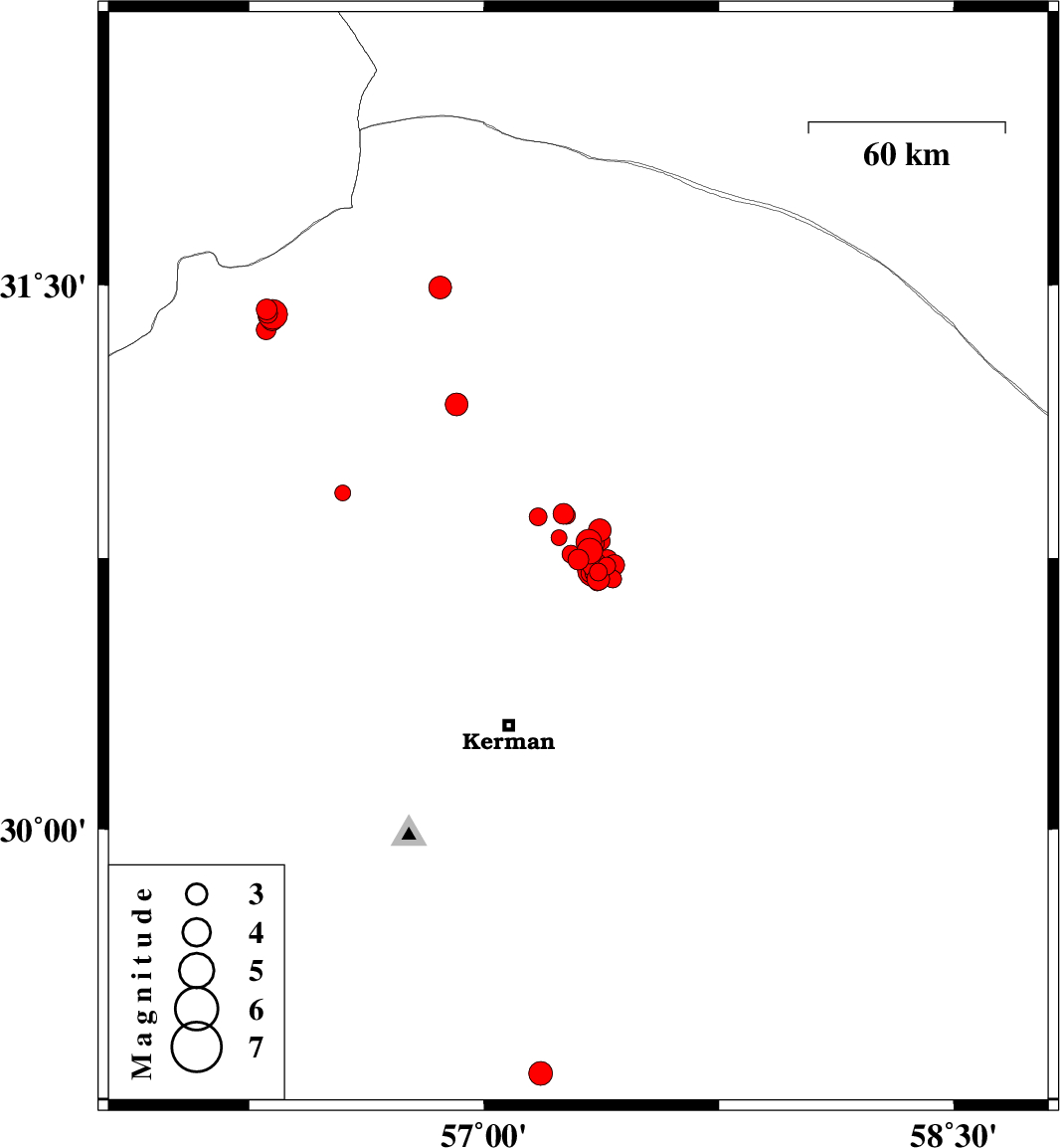 | 2018/01/04 | 13:43:16.2 | 17:13:16.2 | 30.692 | 57.41 | 14 | ML2.5 | Kerman Province, 55 km North-East of Kerman | ||