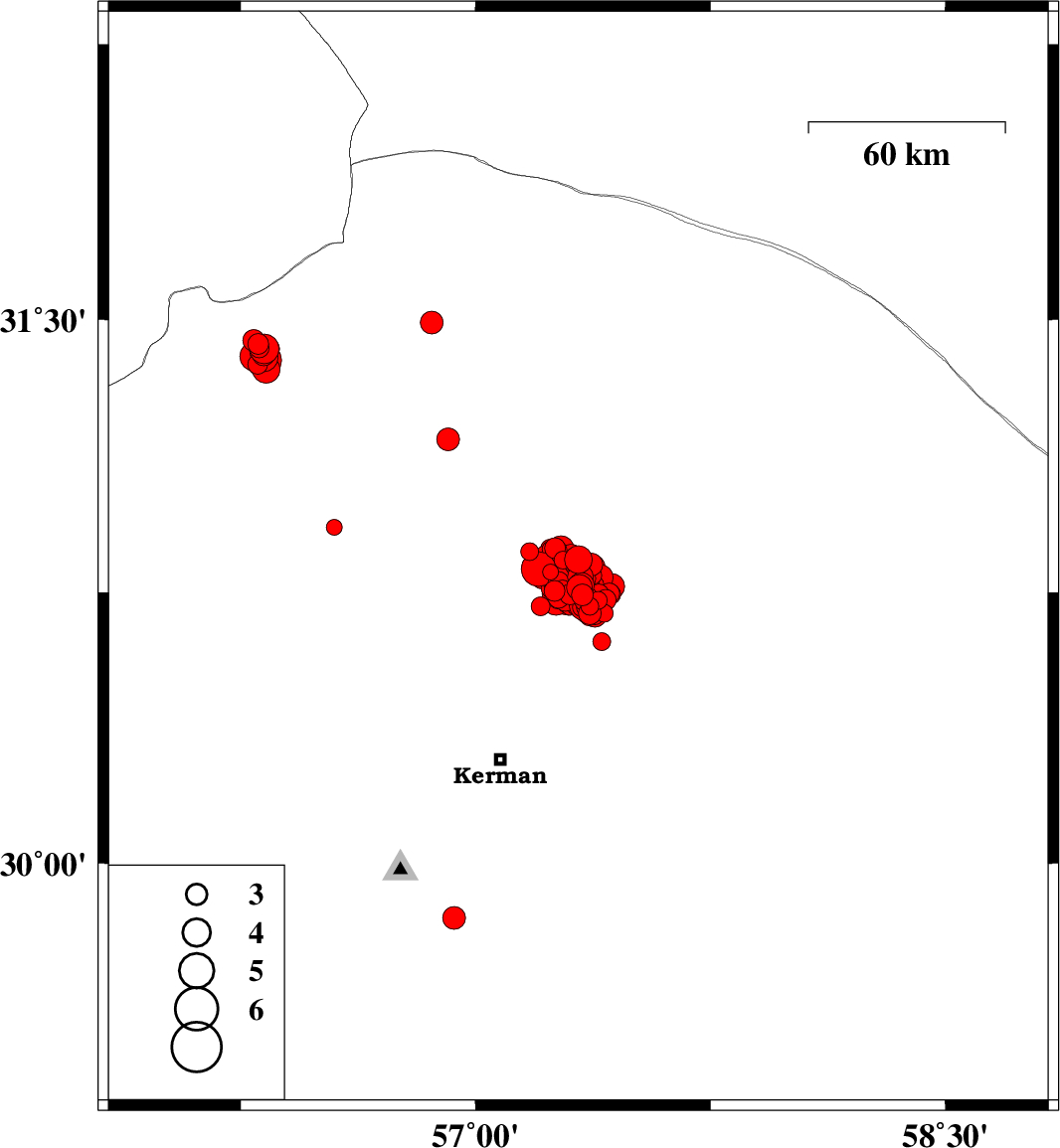 | 2018/01/04 | 13:05:29.0 | 16:35:29.0 | 30.73 | 57.415 | 14 | ML3 | Kerman Province, 59 km North-East of Kerman | ||