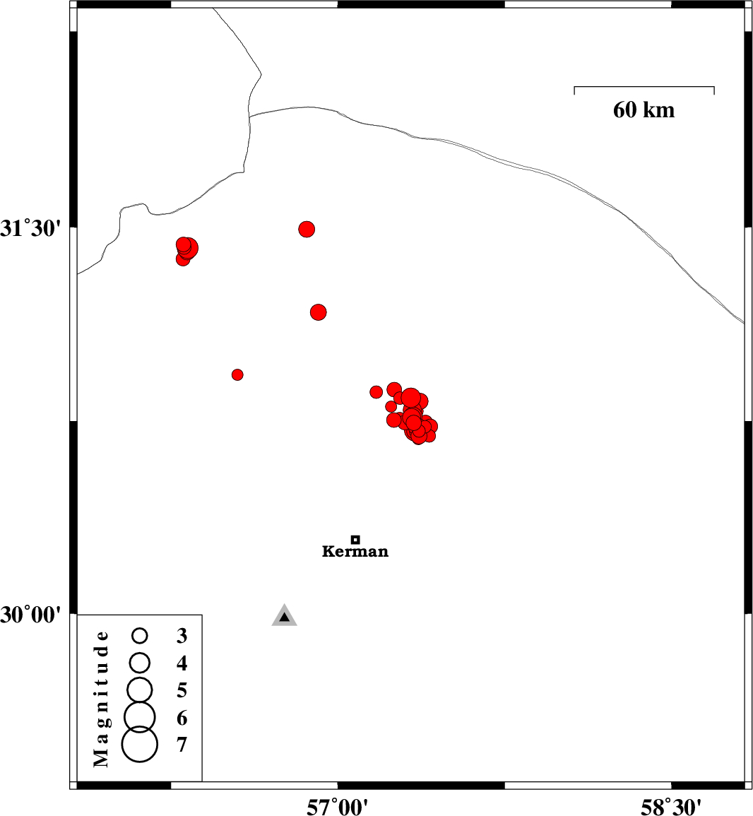 | 2018/01/04 | 03:55:21.8 | 07:25:21.8 | 30.682 | 57.362 | 14 | ML2.4 | Kerman Province, 52 km North-East of Kerman | ||