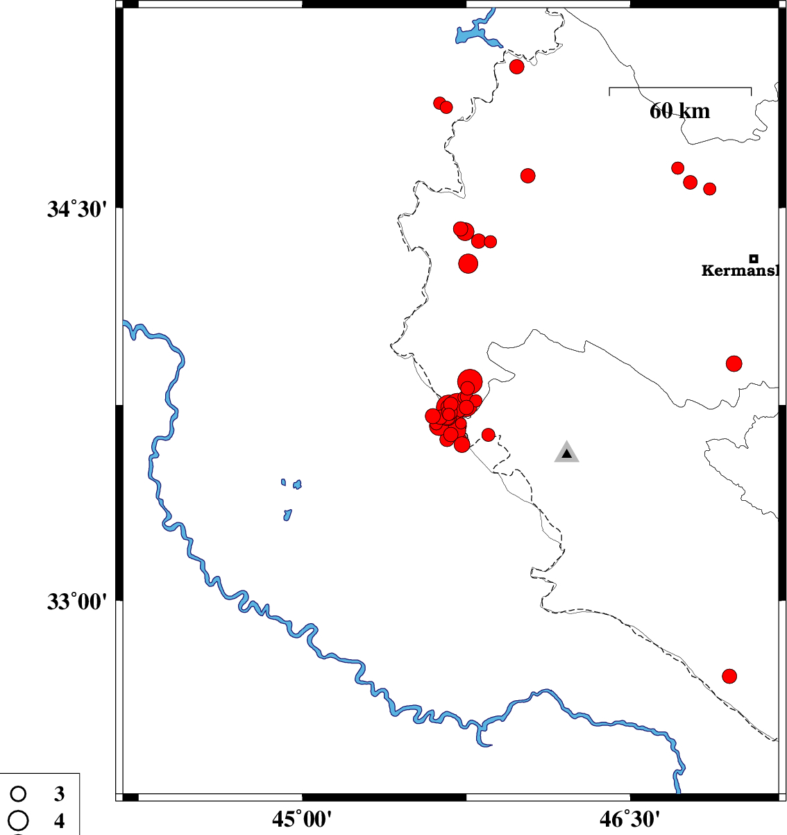 | 2018/01/09 | 13:16:28.5 | 16:46:28.5 | 34.62 | 46.032 | 15 | ML3 | Kermanshah Province, 22 km North-East of Sar-e pol-e zahab | ||