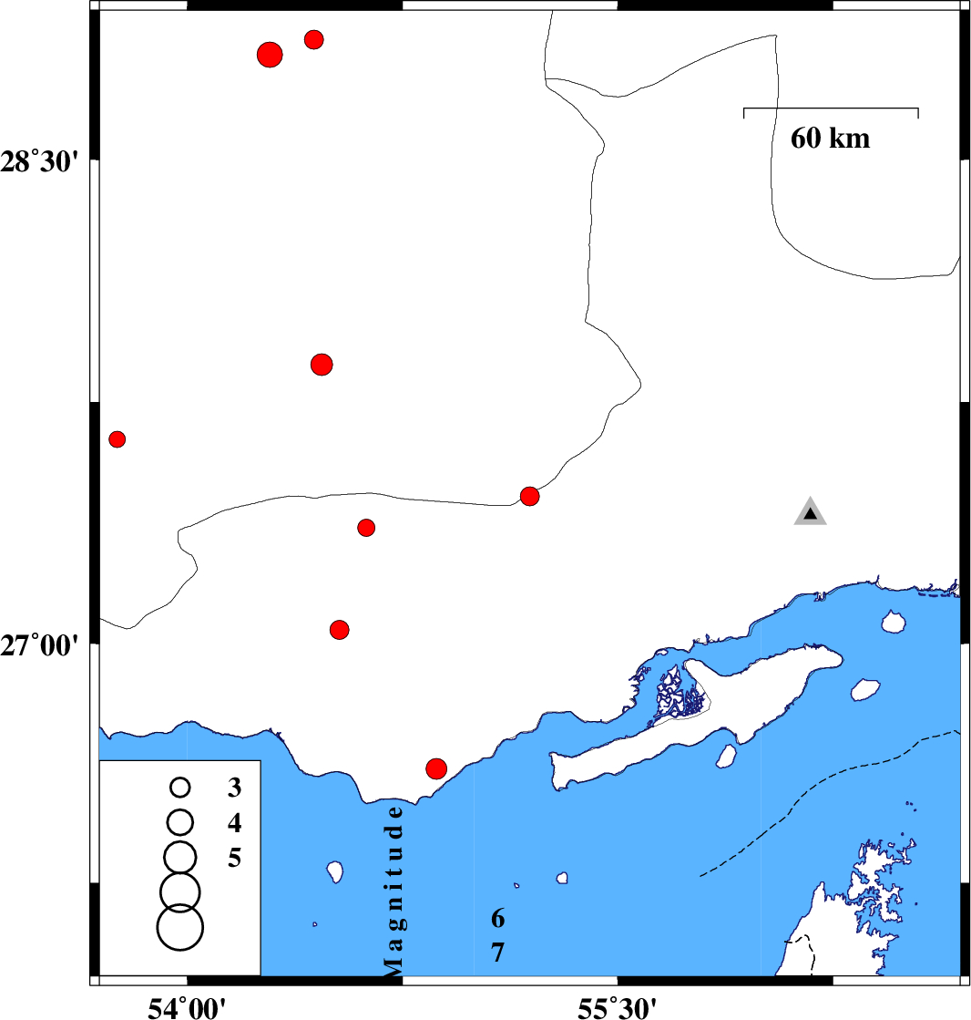 | 2018/01/16 | 20:10:34.8 | 23:40:34.8 | 27.458 | 55.193 | 14 | ML2.9 | Hormozgan Province, 88 km South-East of Lar | ||