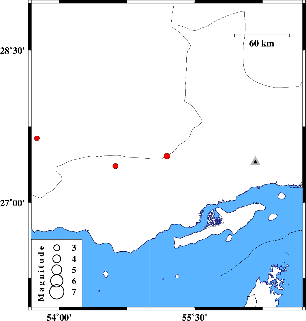 | 2018/01/16 | 20:10:34.8 | 23:40:34.8 | 27.458 | 55.193 | 14 | ML2.9 | Hormozgan Province, 88 km South-East of Lar | ||
