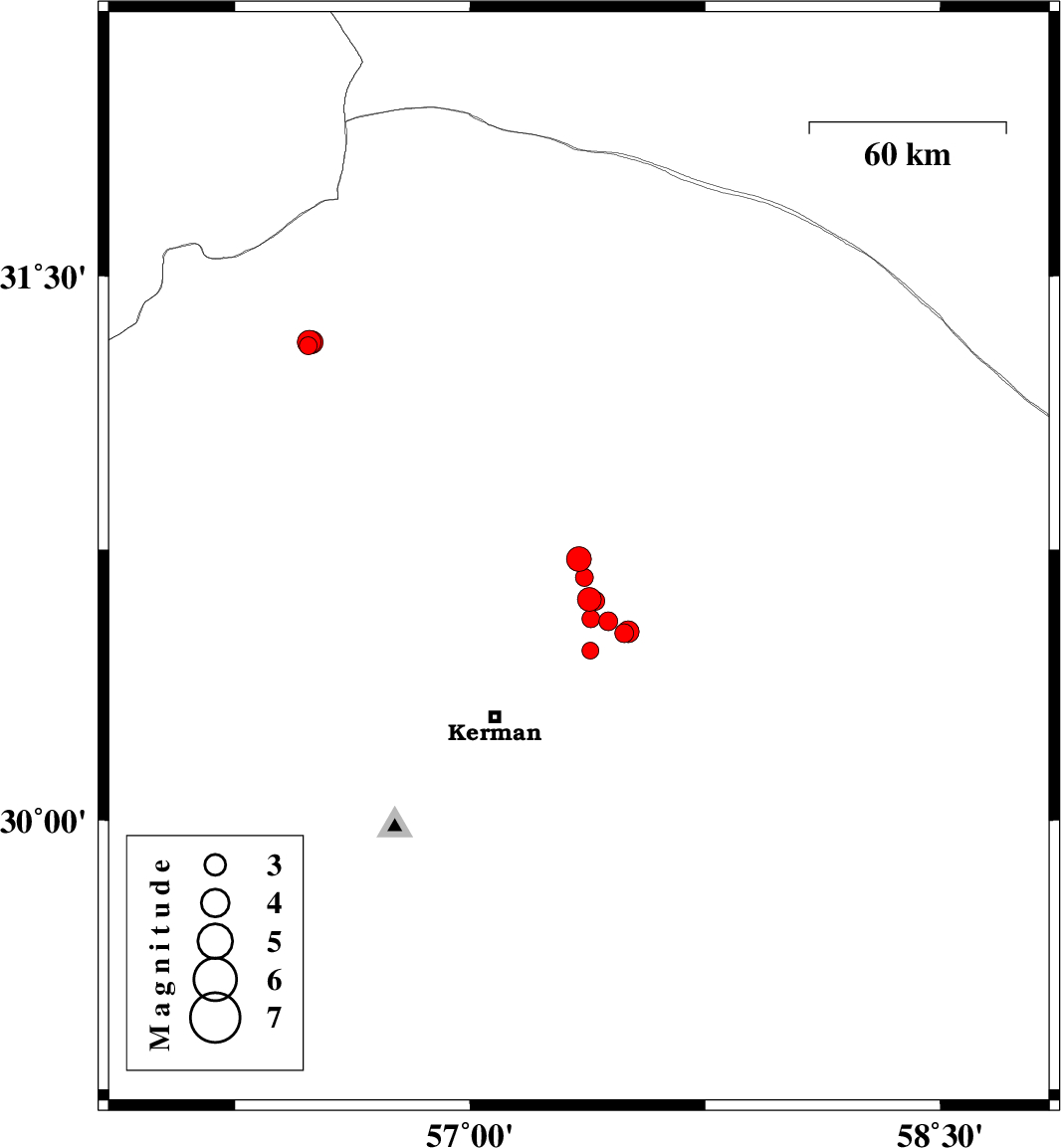 | 2018/01/15 | 06:54:35.4 | 10:24:35.4 | 31.487 | 56.401 | 14 | ML3.3 | Kerman Province, 46 km North-West of Ravar |