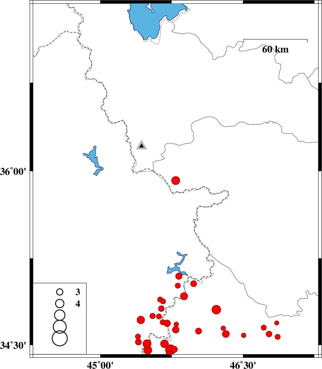 | 2018/01/09 | 13:16:28.5 | 16:46:28.5 | 34.62 | 46.032 | 15 | ML3 | Kermanshah Province, 22 km North-East of Sar-e pol-e zahab | ||