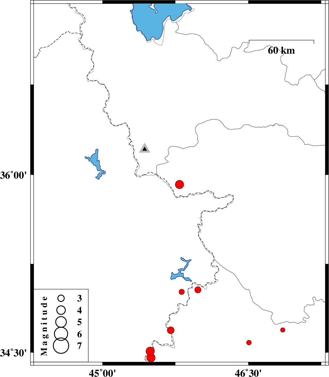 | 2018/01/17 | 00:55:12.5 | 04:25:12.5 | 34.584 | 46.506 | 6 | ML2.2 | Kermanshah Province, 27 km South of Javanrud | ||