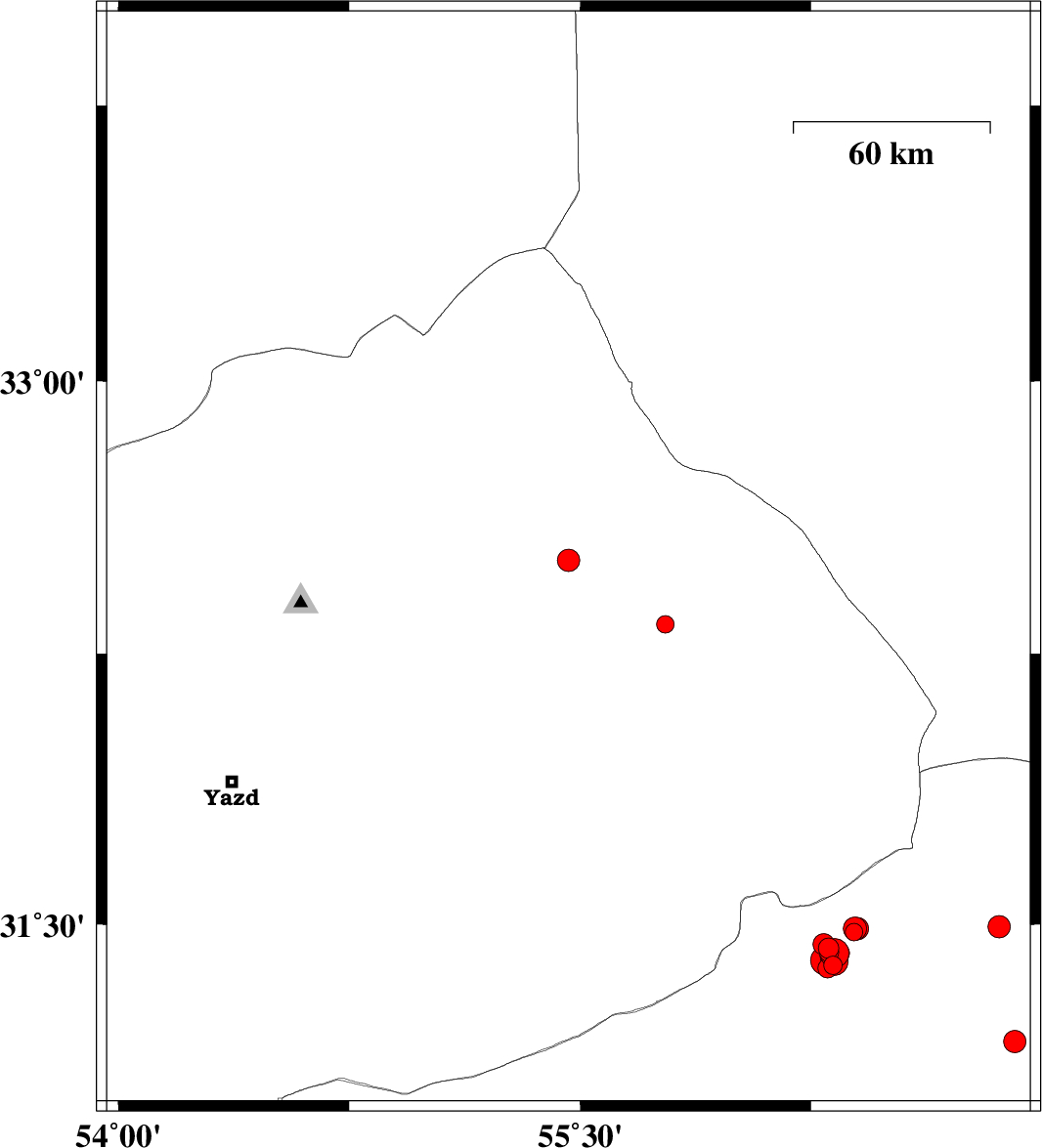 | 2018/01/22 | 10:57:27.1 | 14:27:27.1 | 32.507 | 55.462 | 15 | ML3.3 | Yazd Province, 101 km North of Bafq | ||