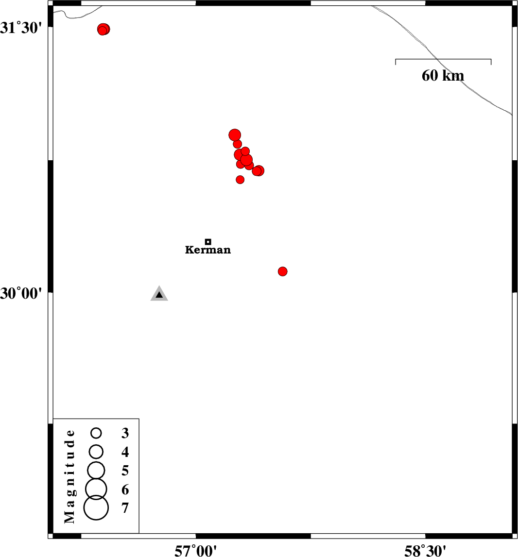 | 2018/01/21 | 14:34:19.4 | 18:04:19.4 | 30.8 | 57.322 | 16 | ML2.6 | Kerman Province, 62 km North-East of Kerman | ||