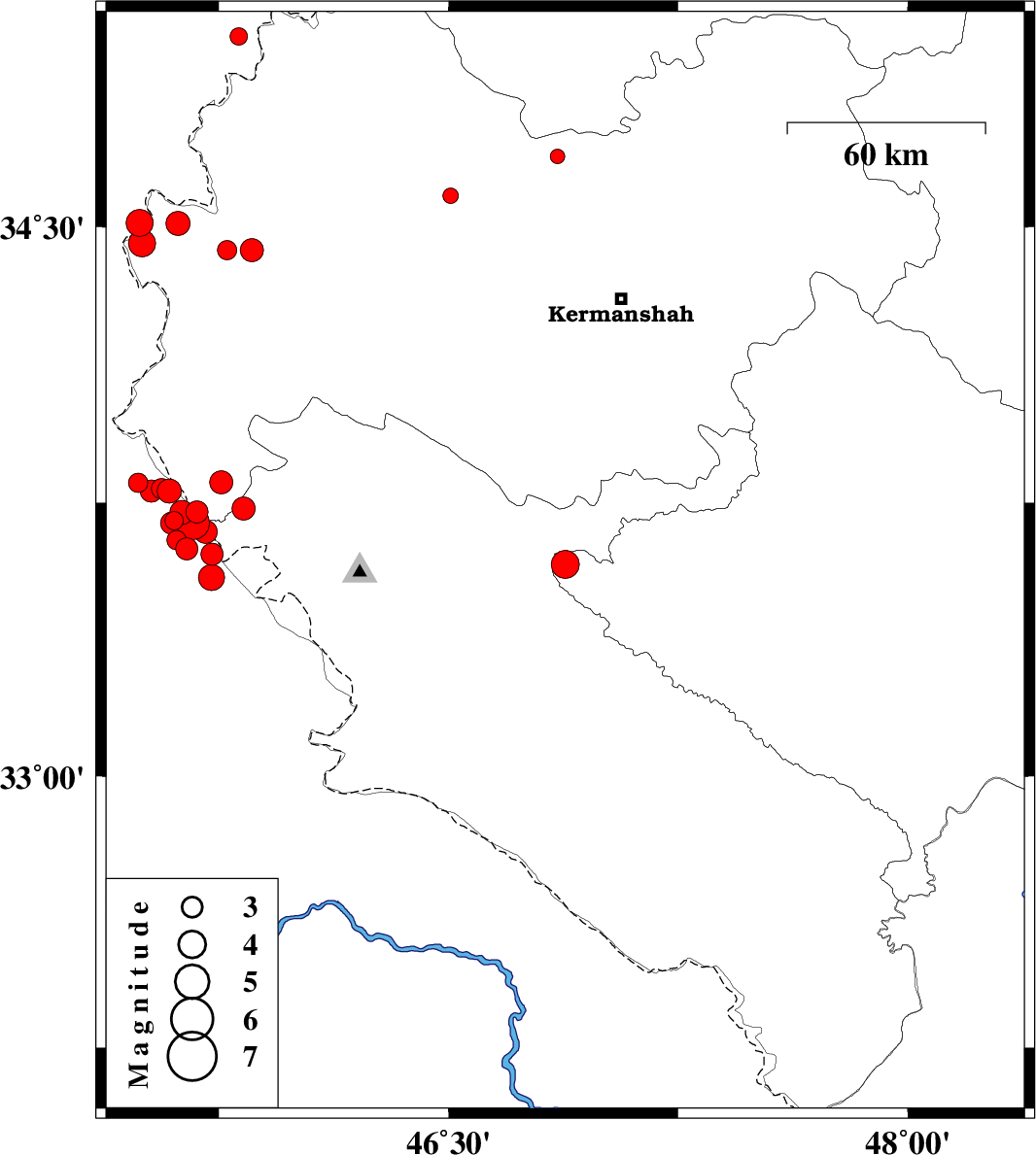 | 2018/01/23 | 08:02:46.8 | 11:32:46.8 | 34.437 | 45.777 | 6 | ML2.8 | Kermanshah Province, 11 km -West of Sar-e pol-e zahab | ||