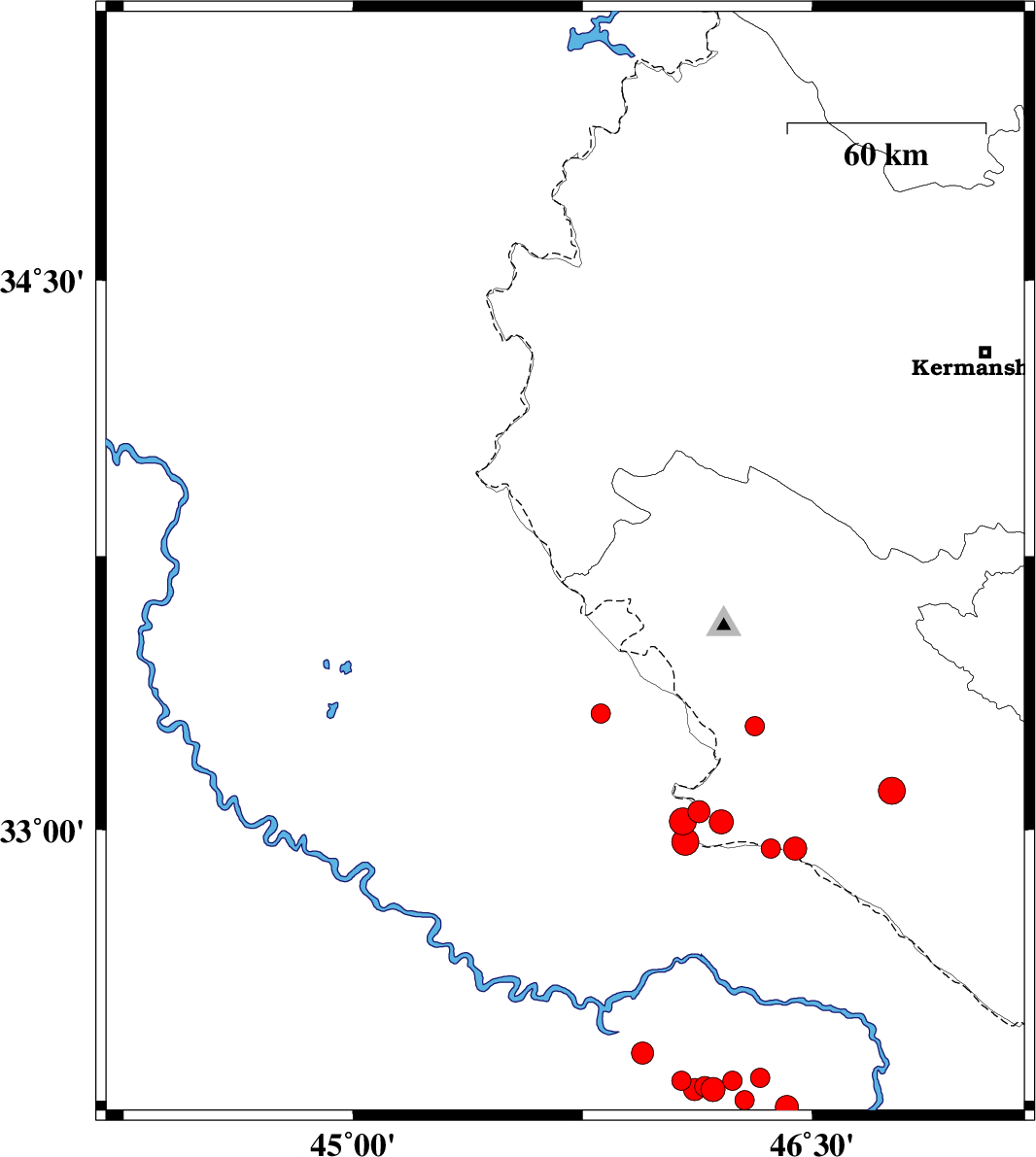 | 2018/01/23 | 08:02:46.8 | 11:32:46.8 | 34.437 | 45.777 | 6 | ML2.8 | Kermanshah Province, 11 km -West of Sar-e pol-e zahab | ||