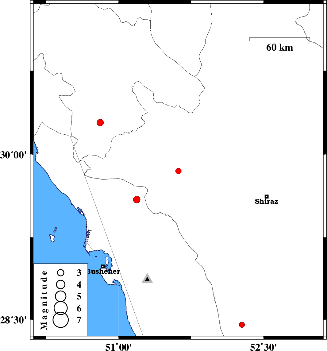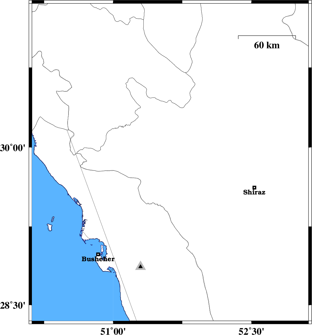 | 2018/01/22 | 13:37:12.5 | 17:07:12.5 | 29.591 | 51.188 | 15 | ML3.3 | Bushehr Province, 37 km North of Borazjan | ||