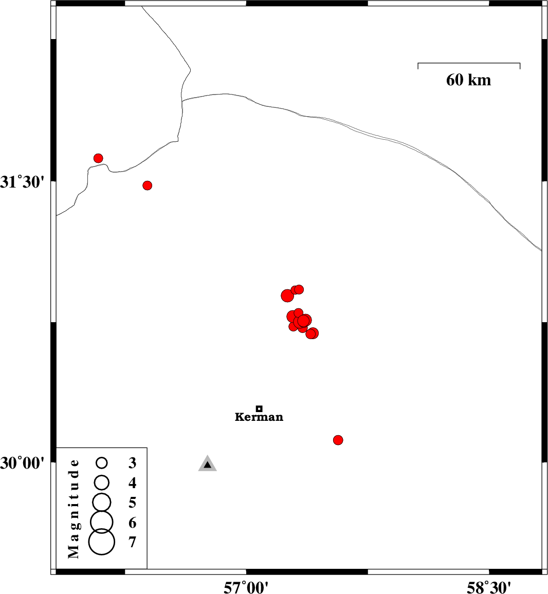 | 2018/01/21 | 14:34:19.4 | 18:04:19.4 | 30.8 | 57.322 | 16 | ML2.6 | Kerman Province, 62 km North-East of Kerman | ||