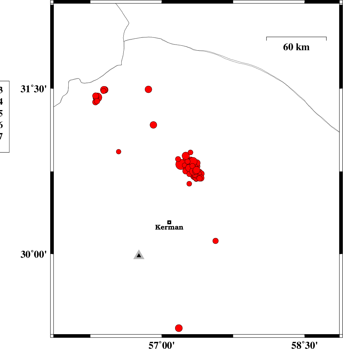 | 2017/12/27 | 10:13:09.7 | 13:43:09.7 | 30.751 | 57.357 | 14 | ML2.9 | Kerman Province, 58 km North-East of Kerman | ||