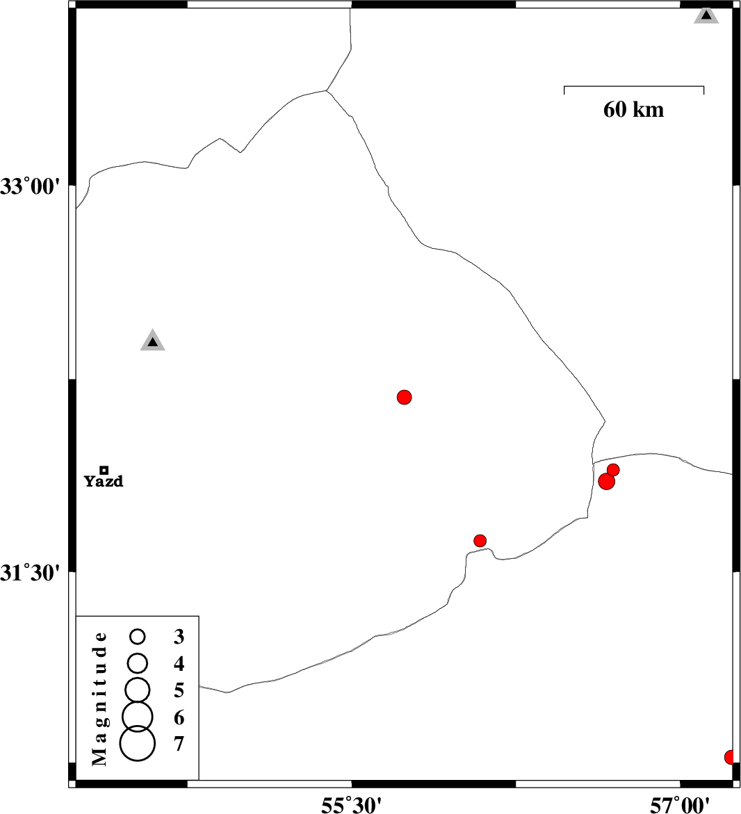 | 2018/01/26 | 15:08:40.6 | 18:38:40.6 | 31.621 | 56.086 | 14 | ML2.6 | Yazd Province, 65 km -East of Bafq |