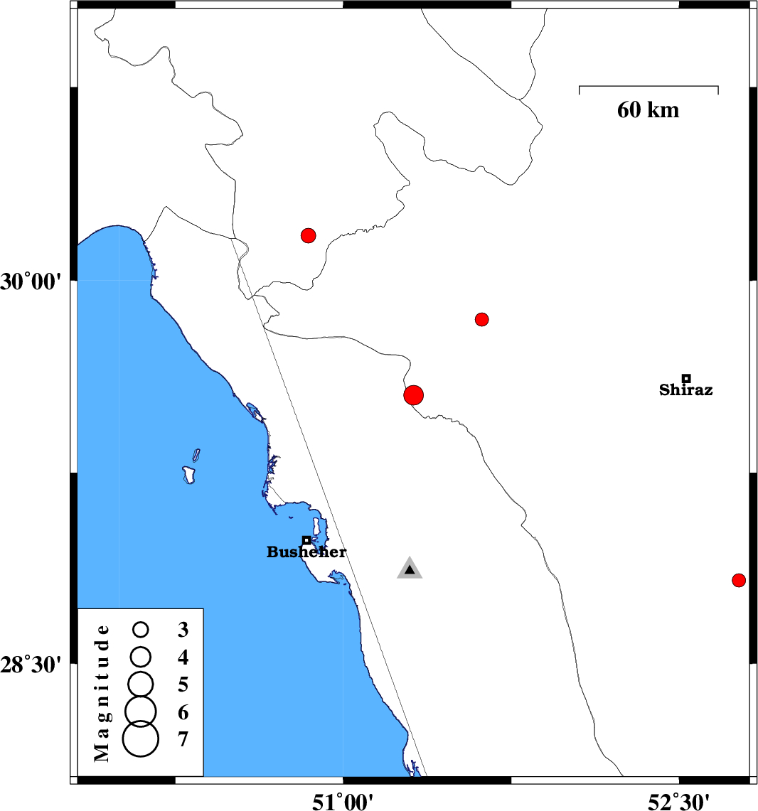 | 2018/01/26 | 16:08:01.6 | 19:38:01.6 | 29.849 | 51.619 | 17 | ML2.7 | Fars Province, 26 km North of Kazerun |
