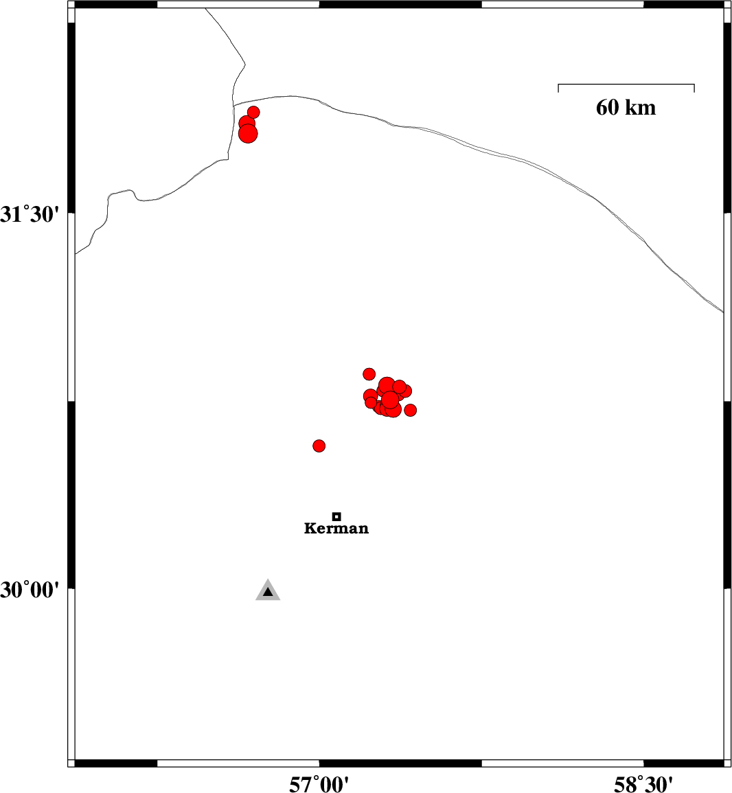 | 2018/01/28 | 05:59:54.8 | 09:29:54.8 | 30.715 | 57.42 | 14 | ML2.5 | Kerman Province, 58 km North-East of Kerman |