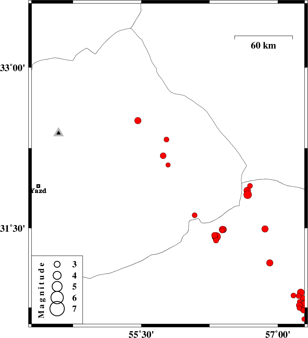 2018/01/19 | 03:13:13.7 | 06:43:13.7 | 30.892 | 57.253 | 14 | ML:3.5 | Kerman Province, 66 km -East of Zarand | ||